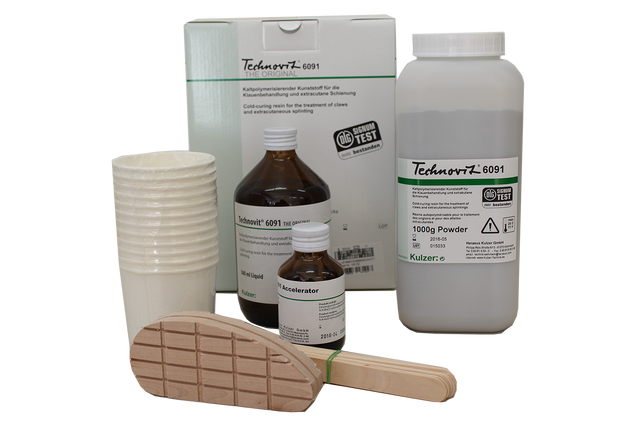 Subsequently to a treatment of 10 minutes, the animal can walk free of pain! The accelerator shortens the polymerisation time of Technovit® 6091 without increasing the polymerisation temperature (different from using a hair-drier to shorten the polymerisation time). The operator is able to adjust the curing time individually by adding the accelerator. In this manner the processing of Technovit® 6091 can be customised perfectly to the personal mode of operation. Particularly at low outside-temperatures the addition of Technovit® 6091 accelerator is highly recommended to shorten the curing time.